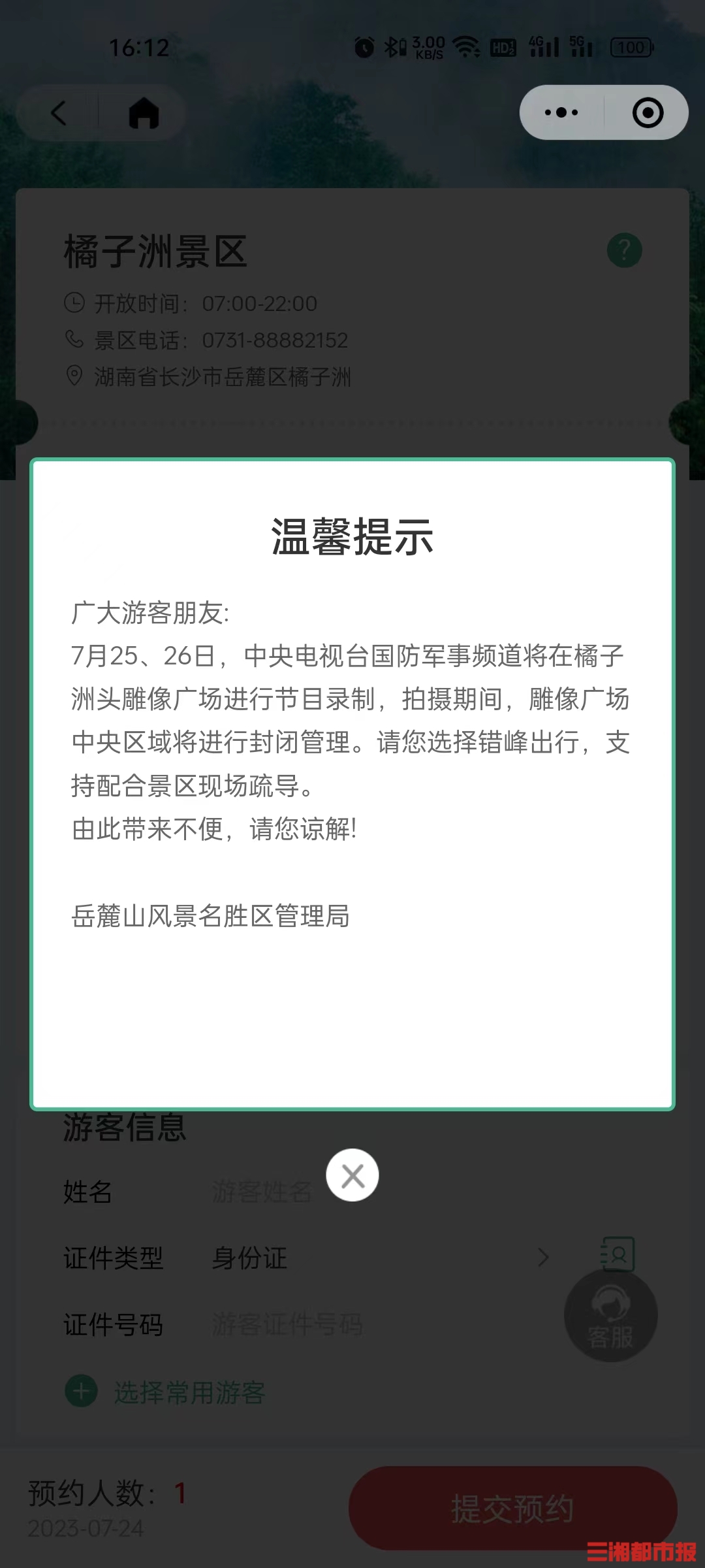 三湘都市报·新湖南客户端7月24日讯(全媒体记者 曾冠霖 实习生 宋科铖)今日,记者从岳麓山风景名胜区管理局获悉,7月25日、26日,中央广播电视总台国防军事频道将在橘子洲头雕像广场进行节目录制,拍摄期间,雕像广场中央区域将进行封闭管理。