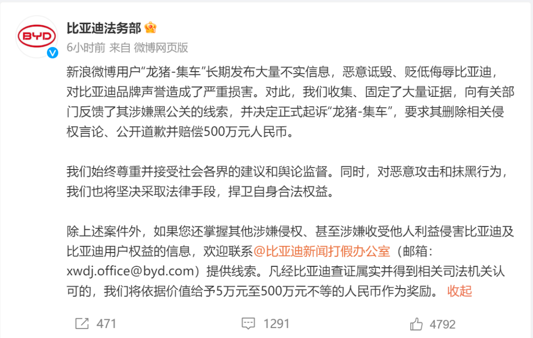 7月24日,比亚迪法务部在社交媒体上发布消息,新浪微博用户“龙猪-集车”长期发布大量不实信息,恶意诋毁、贬低侮辱比亚迪,对比亚迪品牌声誉造成了严重损害。对此,比亚迪收集、固定了大量证据,向有关部门反馈了其涉嫌黑公关的线索,并决定正式起诉“龙猪-集车”,要求其删除相关侵权言论、公开道歉并赔偿500万元人民币。