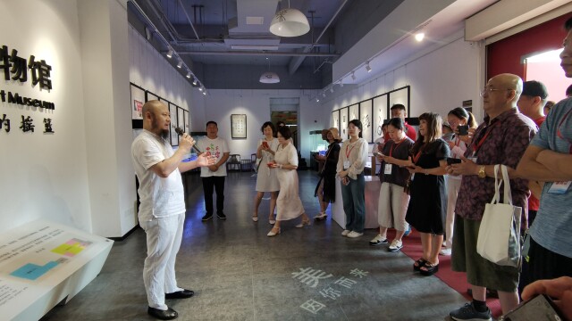 (宋旦汉字艺术博物馆负责人向海外华文媒体记者介绍汉字艺术。黄晗 摄)