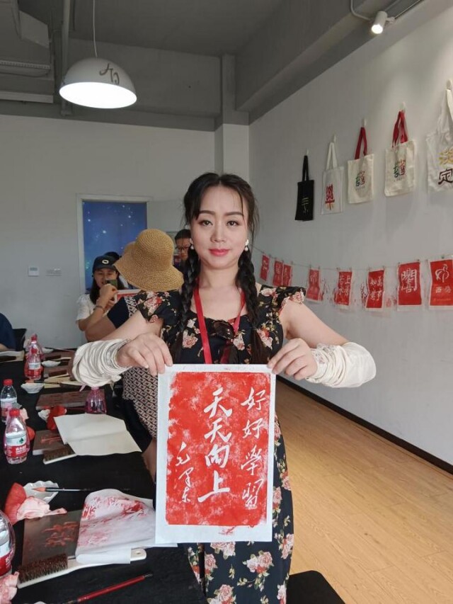 一幅幅风格各异的汉字作品,有序地陈列展示于博物馆内,海外华文媒体记者通过观赏、朗读等方式,近距离感受中国汉字的魅力。在宋旦的指导下,西班牙《欧洲侨声报》记者黄美顺利拓出“好好学习 天天向上”几个字后便爱不释手,第一时间将拓字体验分享到了“华人头条号”。