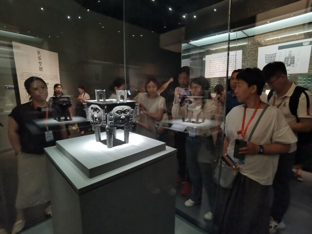 (海外华文媒体记者走进炭河里青铜博物馆参观“人面纹方鼎”。黄晗 摄)