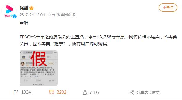 对此,优酷随即也在官方微博回应称,TFBOYS十年之约演唱会线上直播,网传价格不属实,不需要会员,也不需要“抢票”,所有用户均可购买。