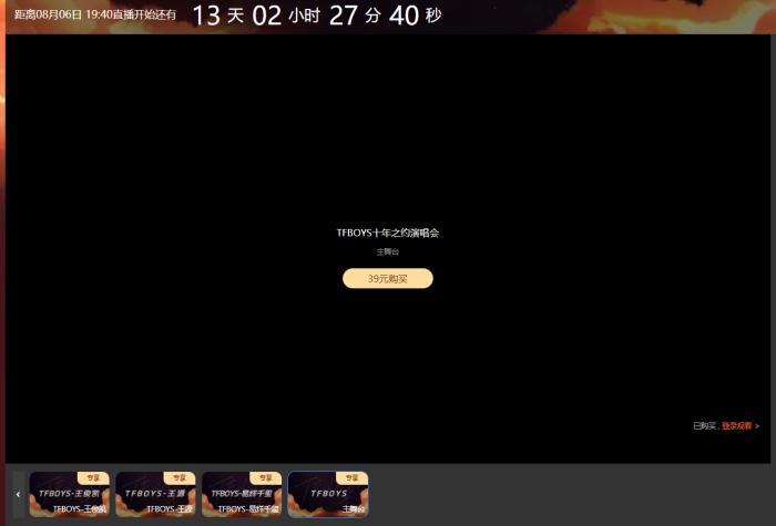 24日13点58分,优酷开售“直播票”。其中,主舞台直播票价为39元,购买时无需VIP。此外消费者还可以单独购买王俊凯、王源、易烊千玺的单人机位直播,每个机位60元。