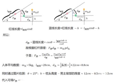 那么,这样的睡姿,杨洋的颈椎到底会承受多大的压力?网友“毕导”根据杠杆原理,也就是头的重力矩就等于颈部肌群的牵引力矩进行了测算。