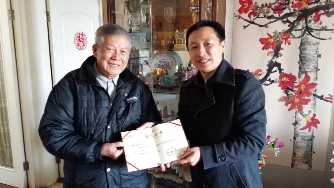 抗馆工作人员向张义生颁发收藏证书。供图/抗美援朝纪念馆