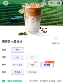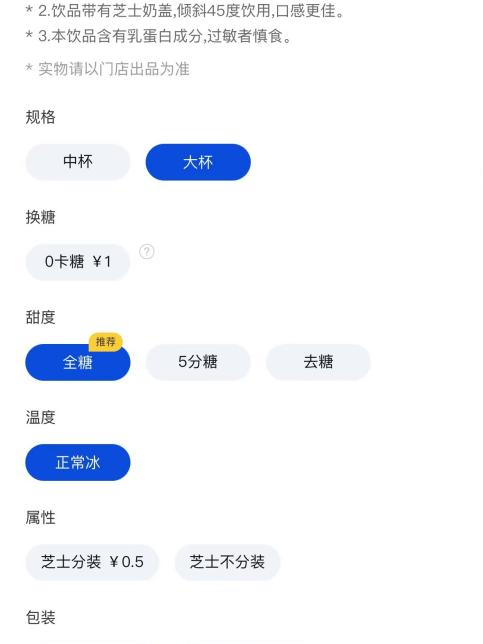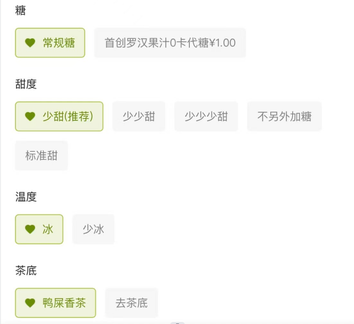 但是其他个性化选项,如糖分的选择已经细化到无糖、3分糖、5分糖、7分糖等多个选项。茶底、奶盖、小料也可以按需自由定制。