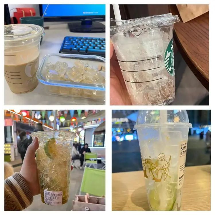 细心的消费者挑出冰块后,饮品只剩下一半,有的只剩下几口。