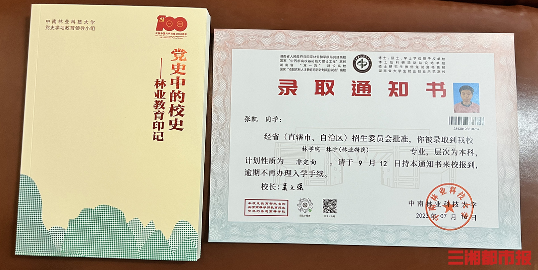 三湘都市报·新湖南客户端7月26日讯(全媒体记者 刘镇东 黄京 实习生 赵金月 罗嘉琪)“恭喜你被中南林录取啦。大学四年要做好人生规划,要以强林兴林为己任,努力成长为党和国家需要的栋梁之材!”7月25日,一位特殊的“邮差”——中国工程院院士、中南林业科技大学校长吴义强将录取通知书送到首届“基层林业特岗”计划录取分数第一名张凯同学的手中。
