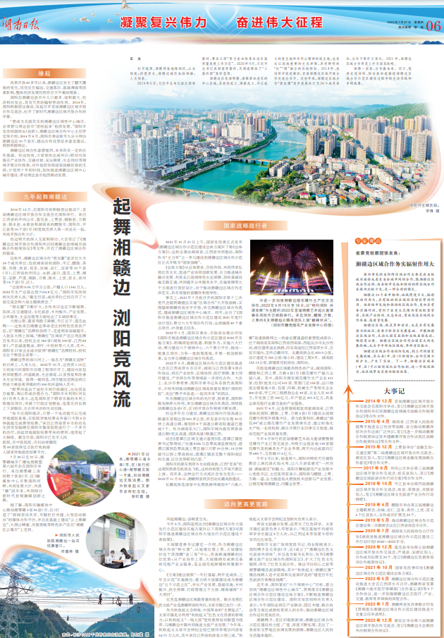 事实上,2021年7月底召开的浏阳市第十三次党代会就明确提出实施“区域合作”大开放战略,实现辐射湘赣的高水平开放,争当湘赣边区域合作典范,建成湘赣边区域性中心城市。同年,出台了《浏阳市推进湘赣边区域合作示范区建设2021年度行动计划》,聚力六大专项合作行动,全面铺排40个重点项目、37项重点任务。