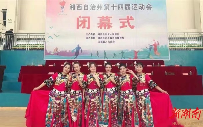 △李佳玉(右三)参加湘西土家族苗族自治州第十届运动会闭幕式演出。