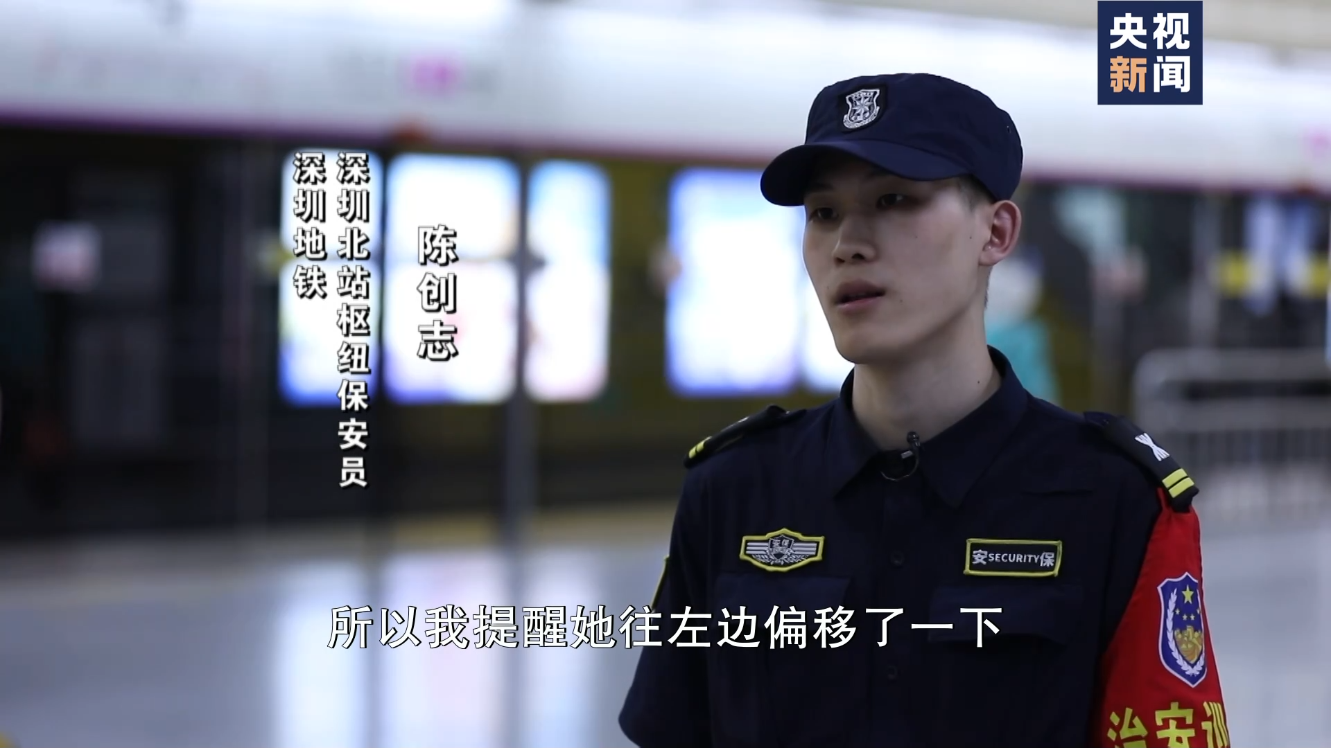 深圳地铁深圳北站枢纽保安员 陈创志:北站的客流量比较多,下车的乘客也较多,所以我提醒她往左边偏移了一下,而且列车到站之后,与站台缝隙有点大,不希望她会绊倒。