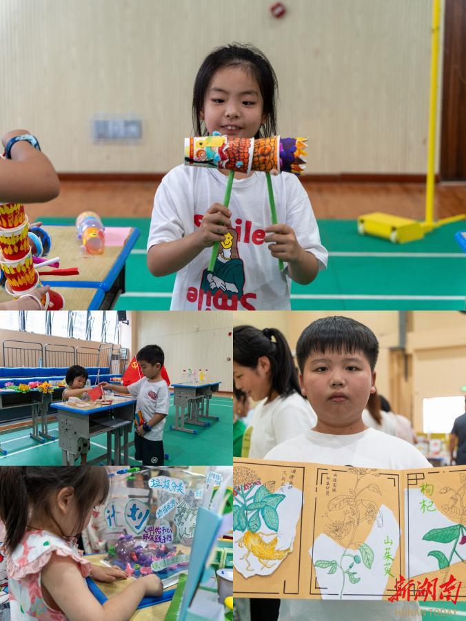 “平面的,立体的,三维的,各种形态无所不有”。在体育馆中依次并列着四个教学点的学生作品两百余件。融合了湖湘文化元素的扎染艺品、簪花、鱼灯、湖南地标折画扇、湘绣等作品,令人赏心悦目;水火箭、自制水井、热气球、降落伞等科技作品,令人啧啧称奇;工整的书画作品、别出心裁的环保小报、栩栩如生的三维立体艺术品都令人拍案叫绝。琳琅满目的作品如同一座小型的博物馆,引得学生和家长饶有兴致地驻足观看,不时用手指物,发出惊叹之声,既为孩子们的创造力而欢呼,更为老师的辛勤付出感到认同。