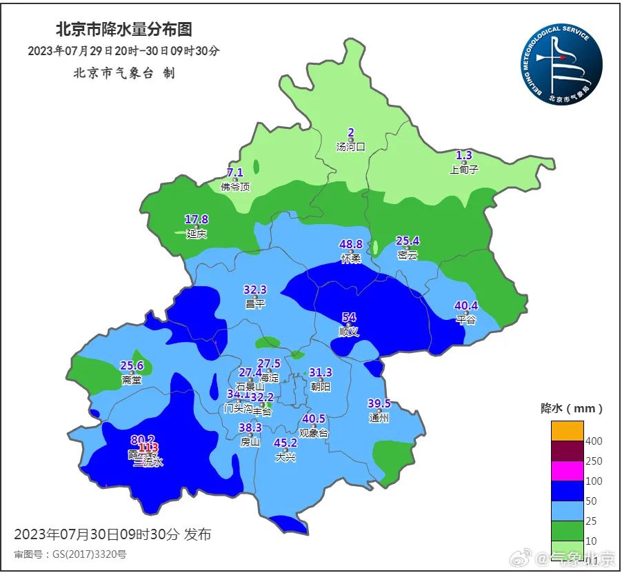 7月29日20时至30日10时,北京地区全市平均降雨量34.2毫米,城区平均33.5毫米;最大降雨出现在房山三流水,120.6毫米;最大小时雨强出现在顺义北石槽,30日06-07时降雨量41.7毫米。