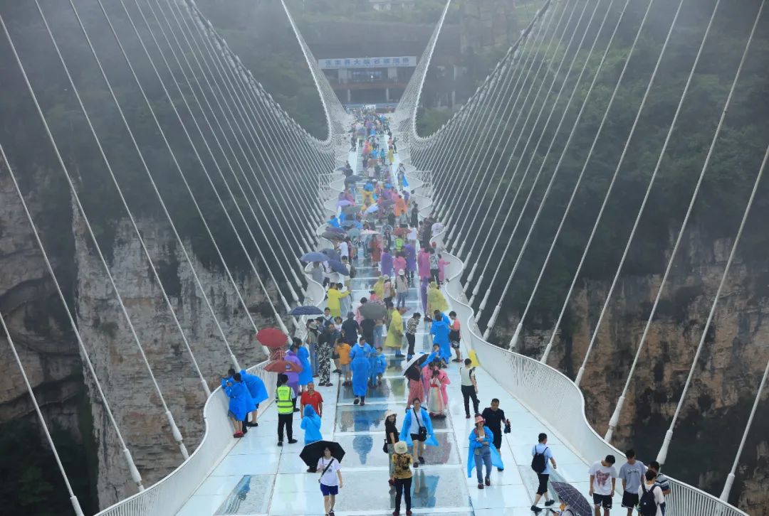 雨中的张家界大峡谷景区云雾缭绕,游人在高空玻璃桥上体验“云端漫步,如履薄冰”的惊险与刺激。 吴勇兵 罗克文 摄