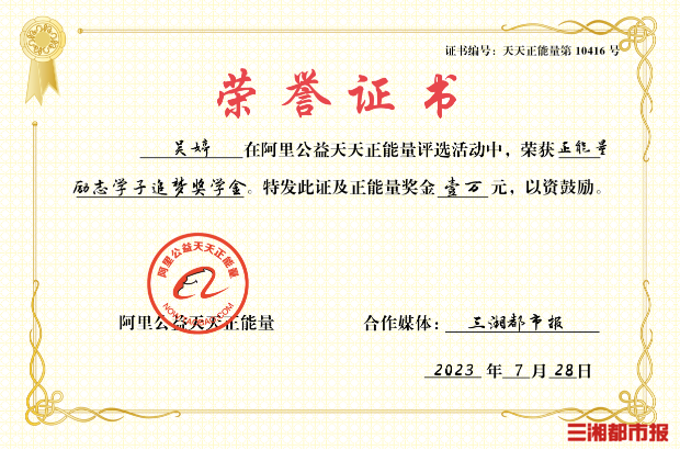 “通过三湘都市报的新闻报道,我了解到阿里公益天天正能量励志学子追梦计划,特别感谢你们对我的帮助。”7月30日,得知自己获得万元奖学金的吴婷激动不已,急切地想要和父母分享这个好消息,希望这笔助学金能让身体不好仍辛勤劳动的父亲压力小一点。