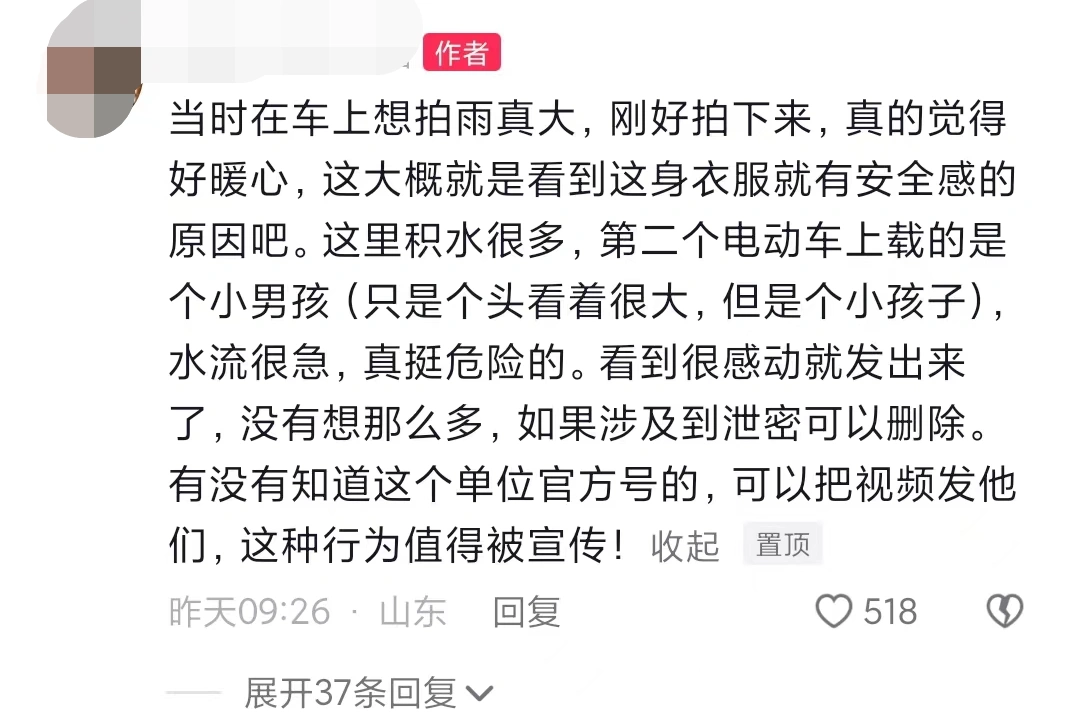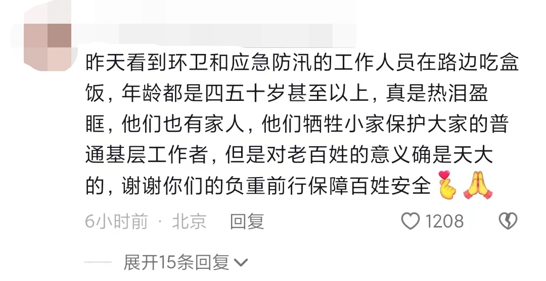 评论中有北京市民表示:“昨天看到环卫和应急防汛的工作人员在路边吃盒饭,年龄都是四五十岁甚至以上,真是热泪盈眶,他们也有家人,他们牺牲小家保护大家的普通基层工作者,但是对老百姓的意义确是天大的,谢谢你们的负重前行保障百姓安全。”