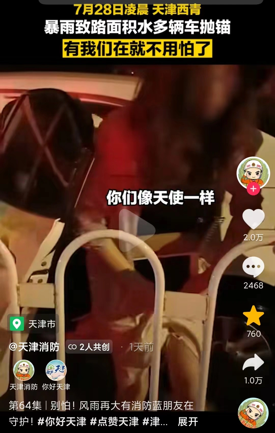 随后天津西青消防冒雨赶赴,他们帮司机拯救车辆,用消防车转移被困群众,逐一带到安全地带。救援过程中,有人直呼:“你们像天使!”网友@布丁 也表示:“这大概是世界上最好的‘陌生人’了吧。”