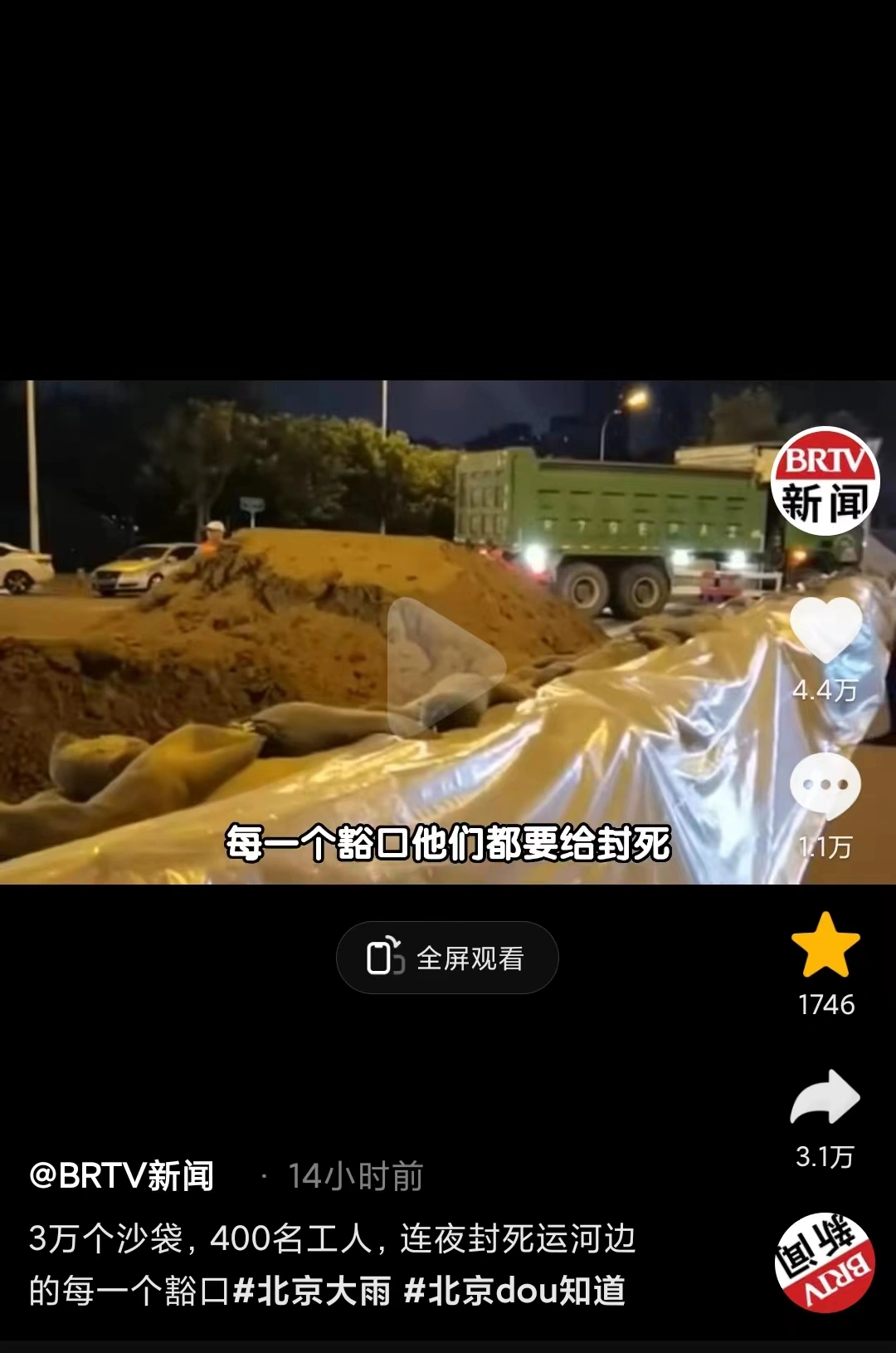 北京:3万个沙袋连夜垒成防洪堤坝