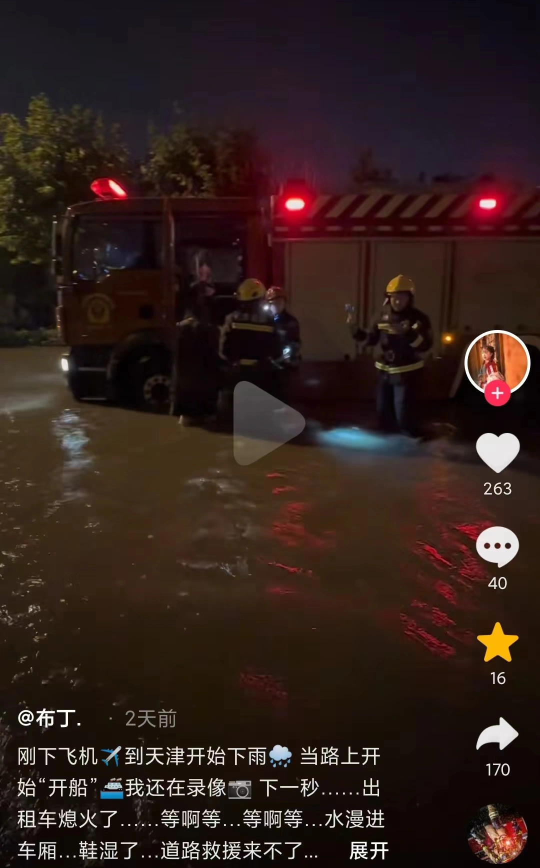 7月28日晚,一位网友@布丁 发文讲述了自己暴雨遇险后被消防救援的经历。她表示,当天到达天津后开始下雨,随后路面积水越来越多,直至漫进车厢内汽车抛锚被困。惊慌之下,她拨打了119求助,119回答:“你们在哪?别着急,我们马上到!”