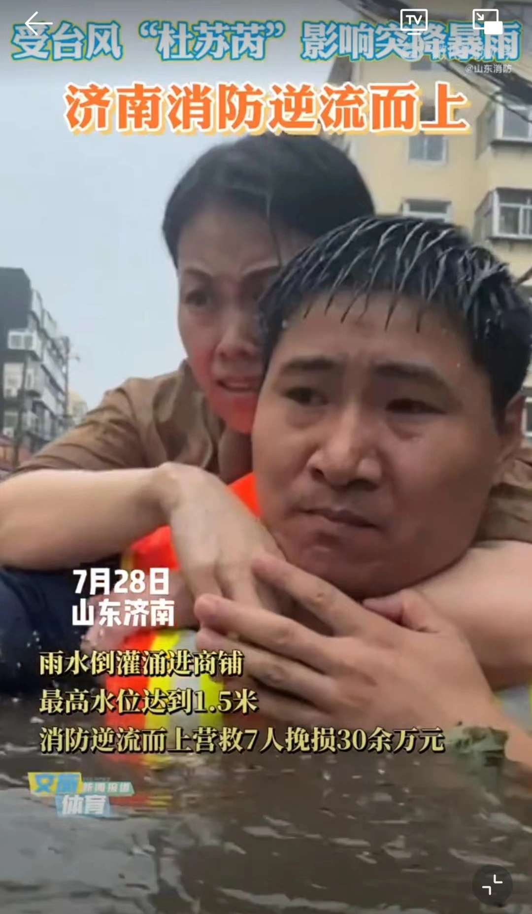 7月28日,受台风“杜苏芮” 影响,济南突降暴雨,雨水倒灌进商铺,最高水位1.5米。济南消防在出警返程中一路救援,逆流而上背出被困群众,默默守护泉城济南。