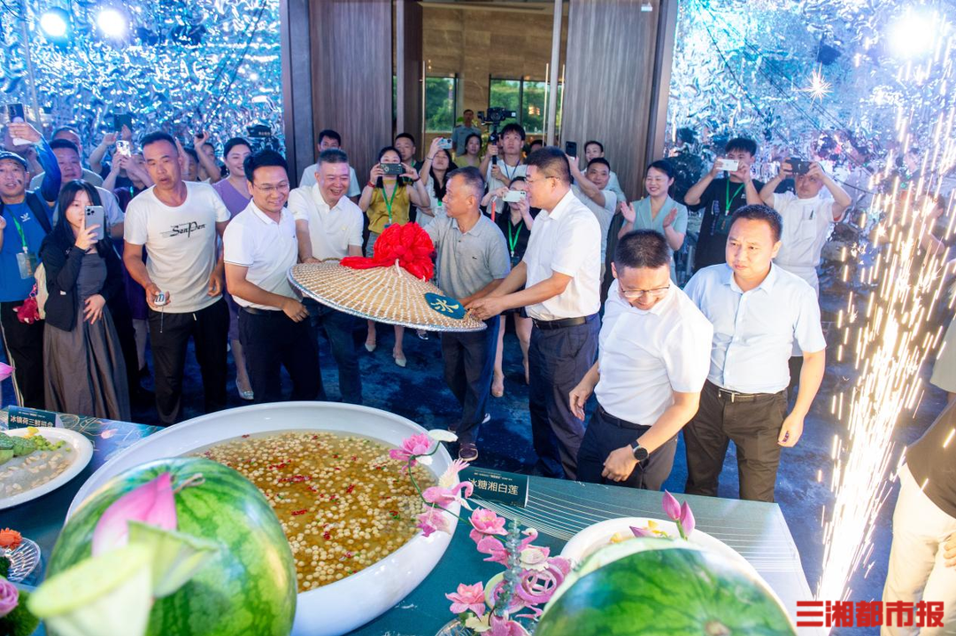 三湘都市报·新湖南客户端7月30日讯(文/视频 全媒体记者 陈潇)7月30日傍晚,湘潭一桌美味佳肴之“湘莲盛宴”亮相“中国湘莲之乡”湘潭县,湘潭市政协原副主席胡振湘,湘潭县委副书记、县人民政府县长王利,湘潭市商务局党委书记、局长唐煜,湘潭市文化旅游广电体育局党委书记、局长朱毅强,湘潭县人民政府党组成员、副县长文香军,湘菜泰斗许菊云、王墨泉、聂厚忠,湖南省餐协及湖南十四个市州餐协代表等领导嘉宾出席。盛宴上,百道湘莲菜品引围观,全国最大的冰糖湘白莲发布。