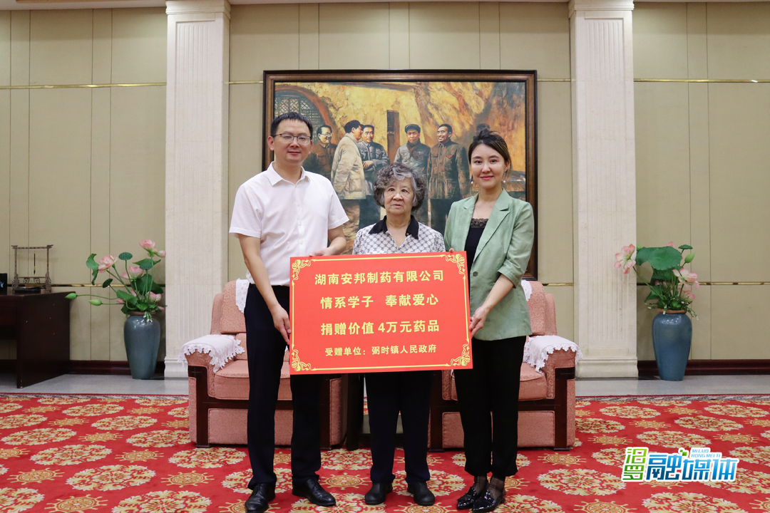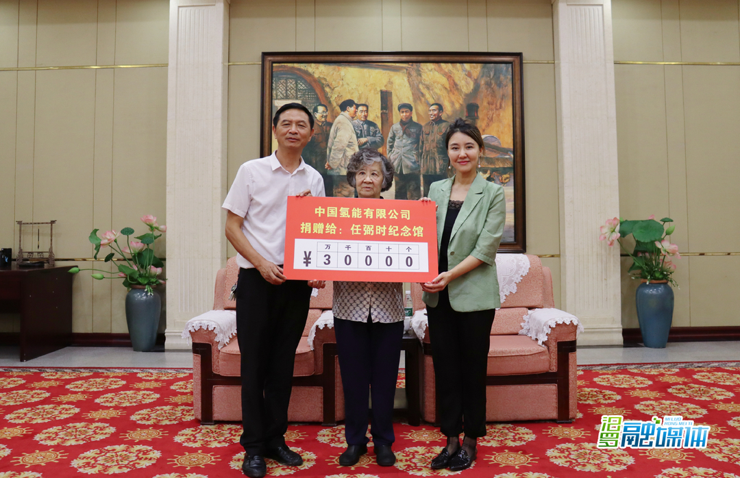 任远芳和女儿武晓明向任弼时纪念馆捐赠庆祝中华人民共和国成立70周年阅兵仪式上任弼时同志的画像,代表中国氢能有限公司向任弼时纪念馆捐赠3万元,代表湖南安邦制药有限公司向弼时镇人民政府捐赠价值4万元的药品。
