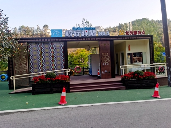 来到插园公路插旗峪社区张插组路段,一处完美融合土家风格的驿站映入眼帘,里面设有公共卫生间、自动售货机和共享充电设施等基础服务设施,为来往游客提供了极大的方便。