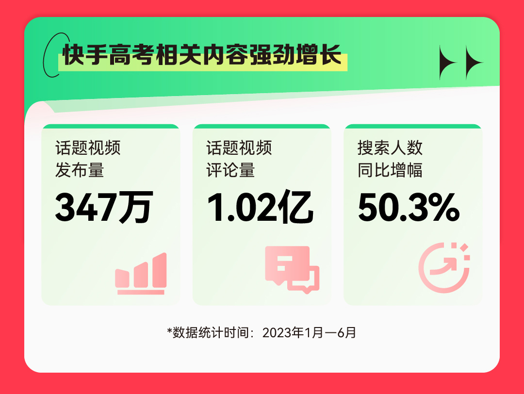 报告显示,2023年1月至6月,快手高考相关话题视频发布量高达347万,相关评论量也达到1.02亿,快手高考内容搜索人数同比增长50.3%。从数据来看,平台高考相关内容的供给与需求双双强劲增长,这意味着,越来越多用户在快手分享、获取高考相关信息。