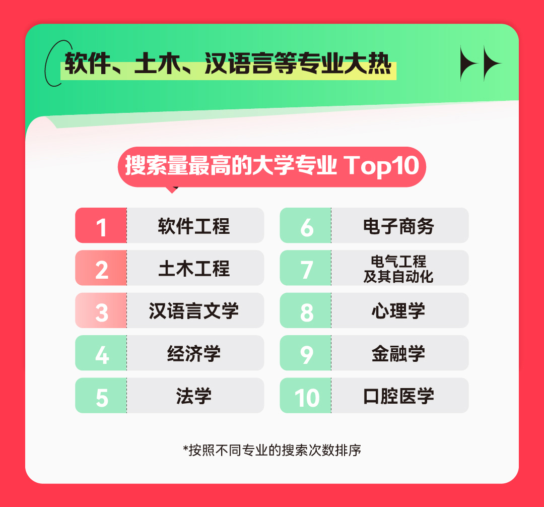 考后的头等大事,便是填报志愿。报告显示,理科生志愿问询需求量更大,快手搜索量前十的大学专业依次为软件工程、土木工程、汉语言文学、经济学、法学、电子商务、电气工程及其自动化、心理学、金融学、口腔医学。总的来说,获得更便捷、详尽的讯息与更专业、丰富的解读之后,这届考生兼顾个人兴趣与专业热度,在理想与现实之间寻求平衡。
