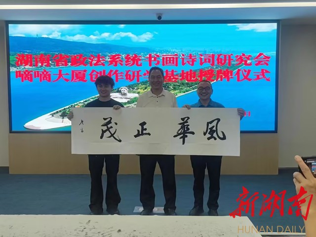 华声在线·新湖南客户端7月15日讯(通讯员 钟建林)诗以言志,文以化人。以法护商,以商促文。7月15日上午,坐落于长沙市芙蓉区“中央文化区”的嘀嘀大厦五楼会议室高朋满座,热闹非凡。“湖南省政法文化嘀嘀大厦创研基地”签约暨挂牌仪式在此隆重举行。省政法系统书画诗词研究会主席团成员彭对喜,副会长刘庆富;诗词分会主席陈岭及副主席贺曦、周加良、江世炎;书法分会主席陈祥松、副主席吴若顺;长沙法官文联副主席胡军军等领导和嘉宾出席活动。