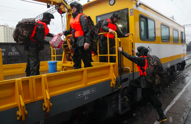 7月31日18时45分,门头沟区雨势仍然很大,三家店火车站内,整装待发的武警战士们正准备登车。他们肩扛、手提、背背,携带面包、泡面、矿泉水和火腿肠,奔赴落坡岭、安家庄火车站,将物资送给因火车停运而受困的旅客。
