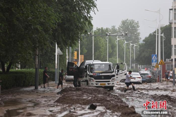 8月1日,北京市门头沟区桥东街,救援车辆拉走受损汽车。中新社记者 盛佳鹏 摄