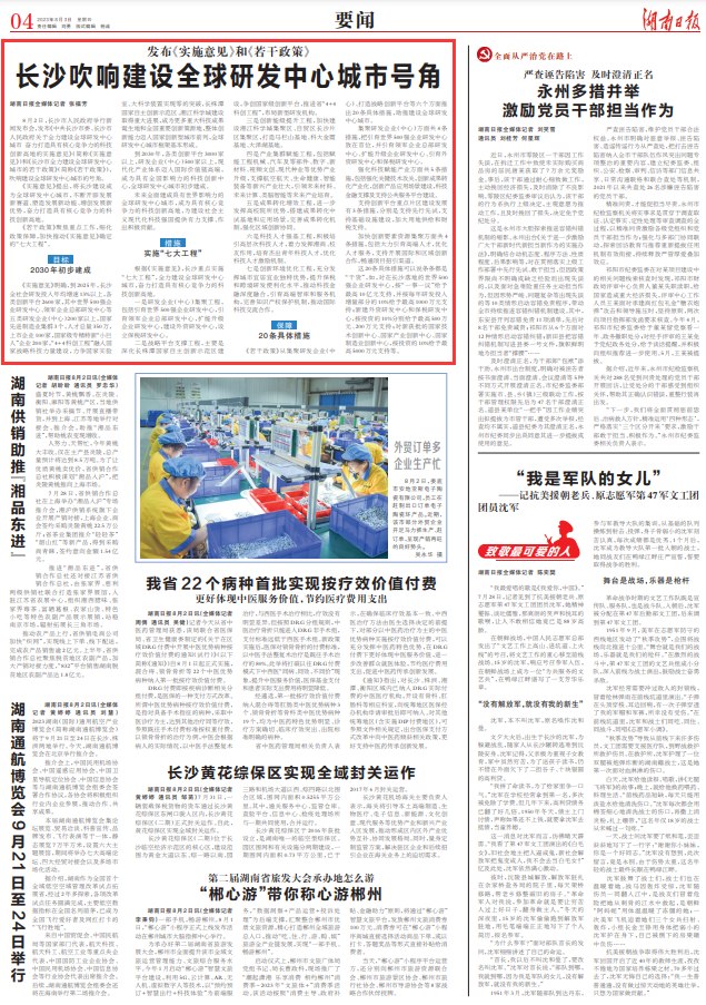 《实施意见》提出,全力将长沙建设成为全球研发中心城市,不断开辟发展新赛道、塑造发展新动能、增创发展新优势,奋力打造具有核心竞争力的科技创新高地;《若干政策》则聚焦重点工作细化政策保障,真金白银推动《实施意见》确定的“七大工程”加快实施。