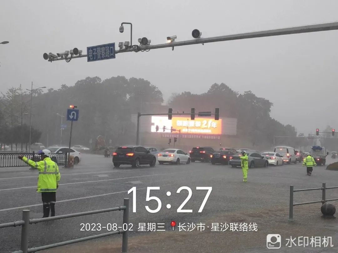 长沙县公安局交警大队民警冒雨在星沙联络线疏导交通。