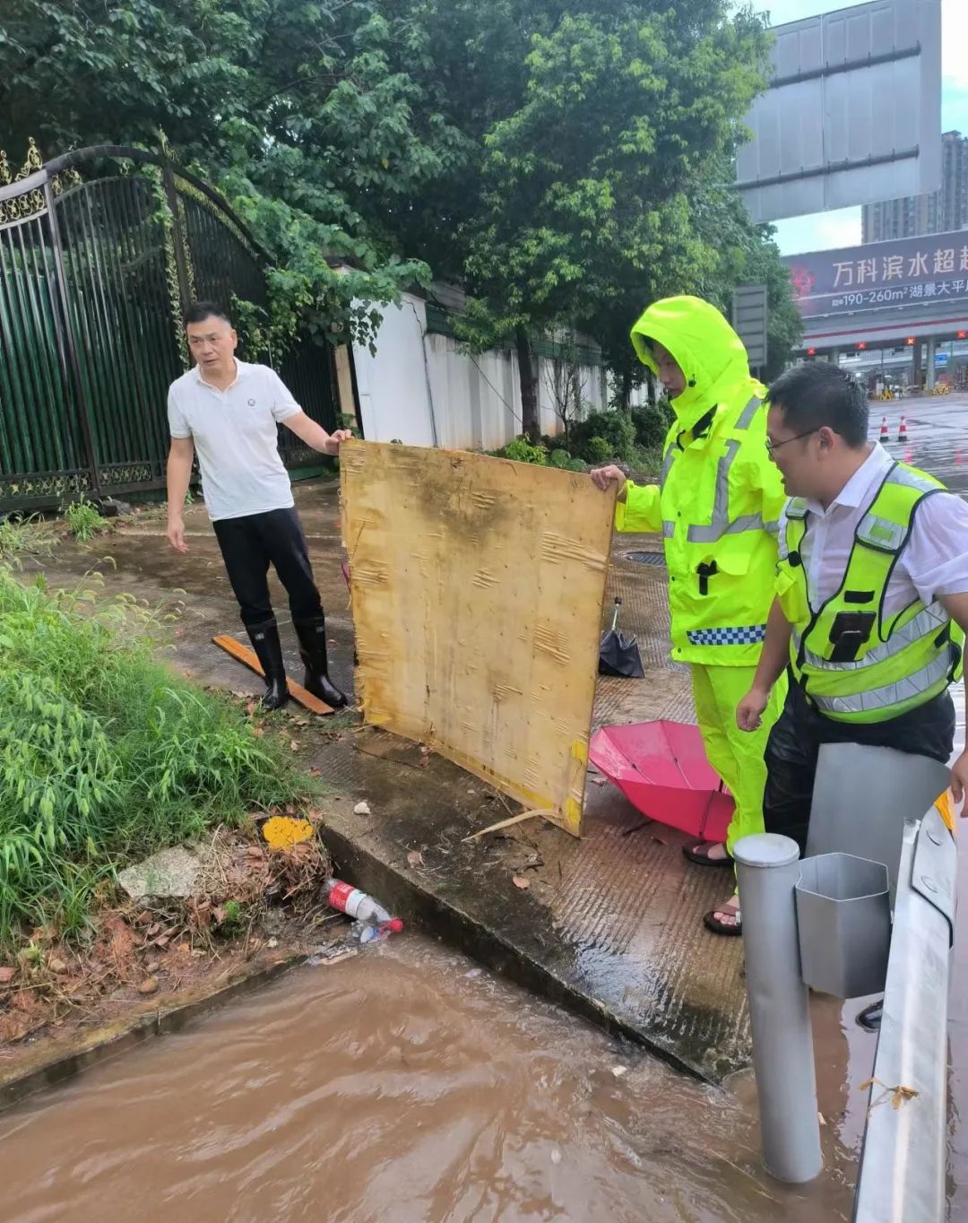 湖南省高速公路集团有限公司长沙分公司工作人员疏通下水管,挪走木板。