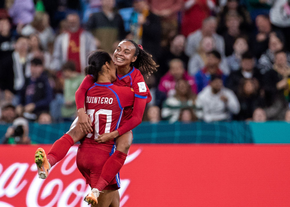 ↑巴拿马队球员利内斯·塞德尼奥(右)在进球后拥抱队友奥尔德里丝·金特罗。