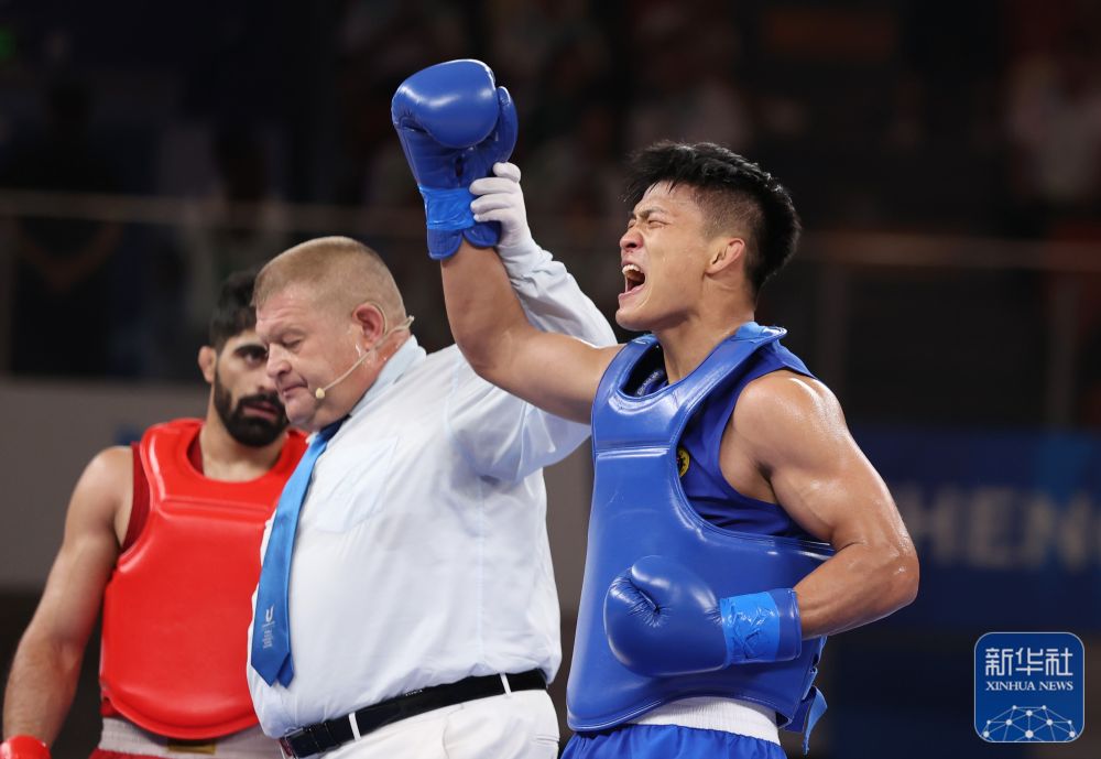 ↑8月3日,中国选手马衣姑在庆祝夺冠。他夺得男子60公斤级决赛中,中国选手马衣姑以2比0战胜印度尼西亚选手盖塔拉,获得冠军。新华社记者 晋美多吉 摄