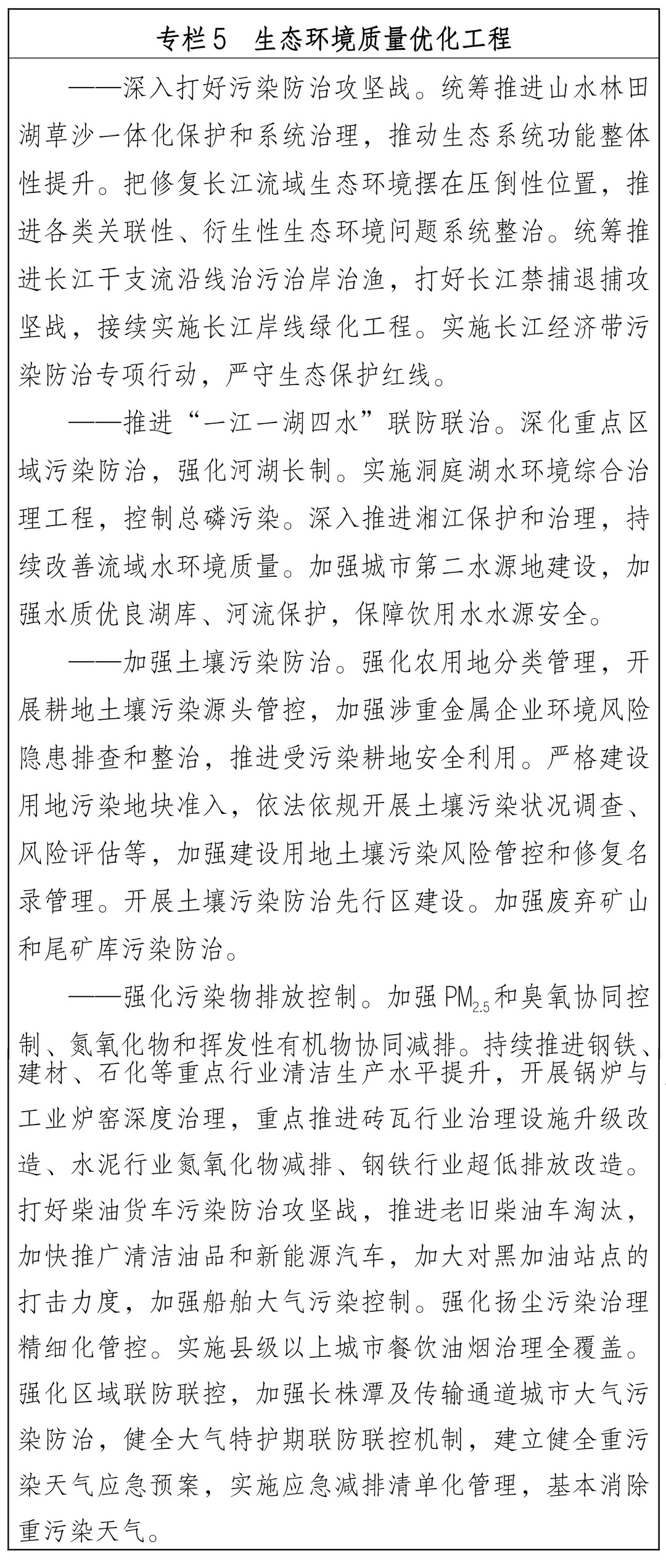 14.持续推进生态环境质量改善。以改善生态环境质量为核心,深入实施大气、水、土壤污染防治行动,统筹经济高质量发展、常态化疫情防控、碳排放达峰行动和生态环境保护。持续改善空气质量,推进各项大气污染物的协同控制,加强对工业、机动车船等大气污染的综合防治。大力推行河湖长制,推进“一江一湖四水”系统保护和治理,实施洞庭湖总磷污染控制与削减攻坚行动,保障水生态安全,维护水生态系统功能。进一步提升生态环境监测质量和水平,强化污染源现场监察,严格把好“两高”项目环评审批关,严厉打击环境违法行为,全面提高生态环境治理现代化水平。