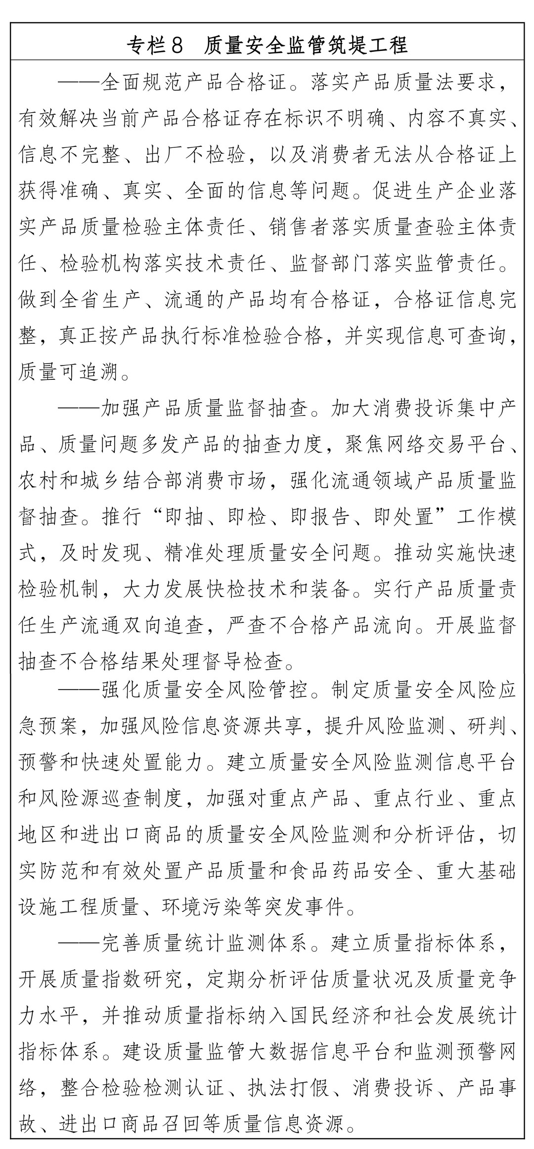 21.提升质量安全监管效能。构建以“双随机、一公开”监管和“互联网+监管”为基本手段、以重点监管为补充、以信用监管为基础的新型监管机制。依法严格对涉及人民群众身体健康和生命财产安全、公共安全、生态环境安全的产品以及重点服务领域实施监管,加大对制售假冒伪劣商品等违法行为的打击力度。完善产品质量监督抽查制度,加强工业品、消费品和网络平台销售商品质量监督检查,推动实现生产流通、线上线下一体化抽查。建立健全产品质量安全风险监控机制,完善产品伤害监测体系,开展质量安全风险识别、评估和处置。建立健全产品质量安全事故强制报告制度,开展重大质量安全事故调查与处理。严格进出口商品质量安全检验监管,持续完善进出口商品质量安全风险预警和快速反应监管机制。加强产品召回技术支撑,强化缺陷产品召回管理。