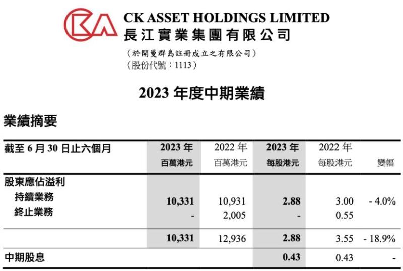 中报显示,截至2023年6月30日,长江实业集团未经审核的持续业务股东应占溢利为103亿港元,同比减少20.14%;每股盈利2.88港元,同比下滑18.9%;每股中期股息0.43港元。