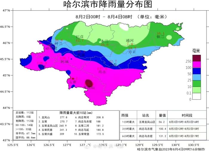 哈尔滨市气象局发布的哈尔滨市降雨量分布图显示,8月2日零时至8月4日8时,降雨量最大的站为龙凤山。
