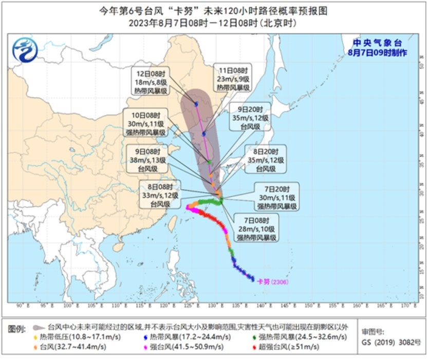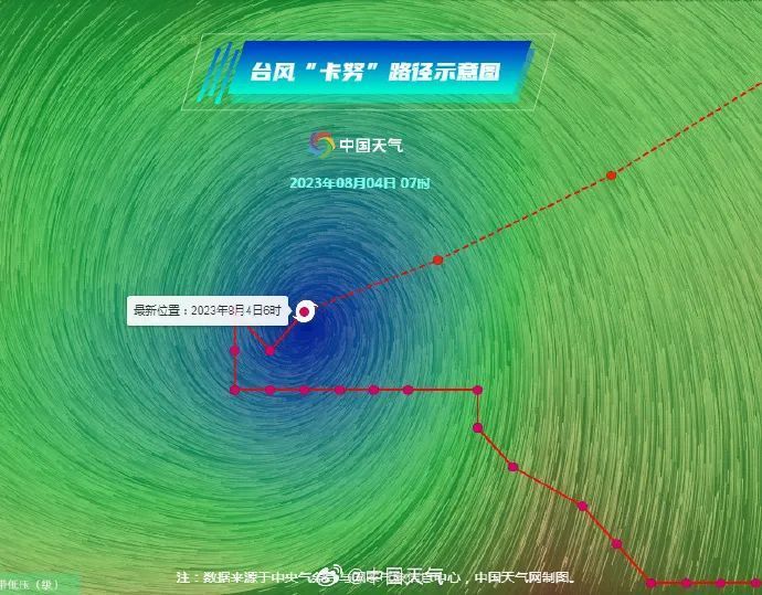 预计,“卡努”先将以每小时5-10公里的速度向偏北转北偏西方向缓慢移动,移速逐渐加快,强度将有所增强,并向朝鲜半岛南部沿海靠近。