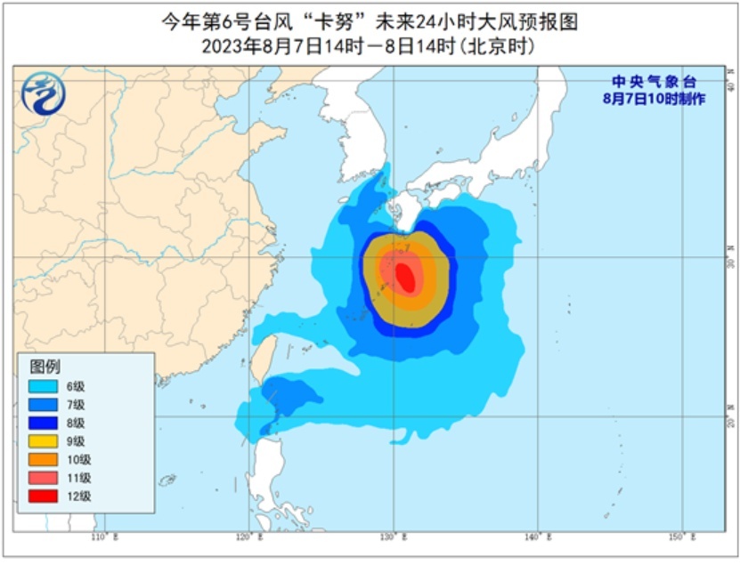 8月7日14时至8日14时,巴士海峡、台湾海峡北部、台湾以东洋面、东海南部和东部及钓鱼岛附近海域将有6-7级、阵风8-9级的大风,其中东海东部部分海域风力可达8-11级,阵风12-13级。