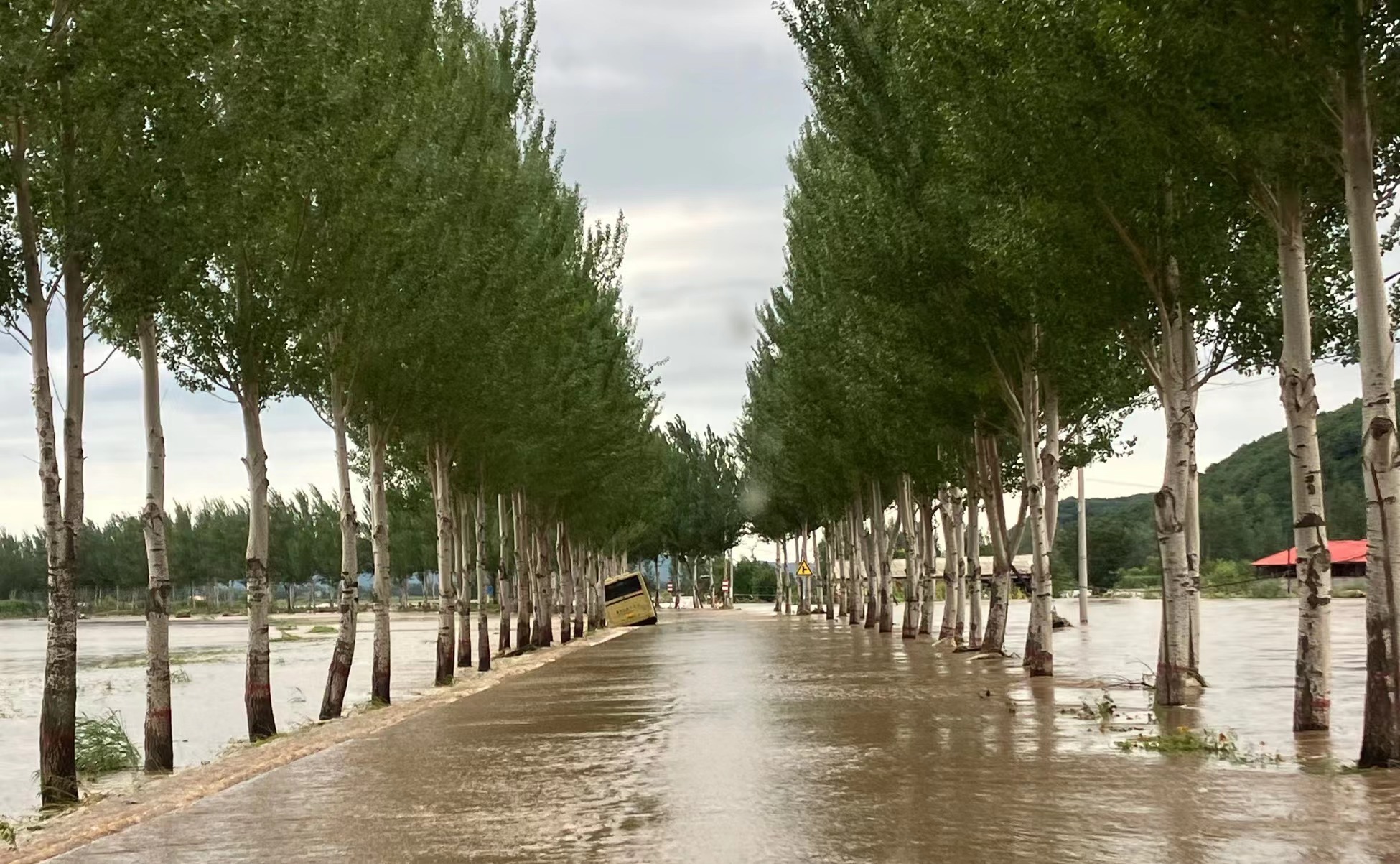 拉林河水漫过路边,淹没道路另一侧的田地,一辆公交车被冲倒出路面靠在树上
