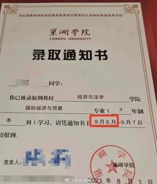 有考生在“巢湖学院”短视频平台账号下晒出自己收到的录取通知书,留言“到底是九月还是六月?”“录取通知书居然都能有错”“这印刷有够粗心的”“开学第一课,找错别字”……对此,不少网友认为,这么低级的错误,不应该出现在高校,更不应该出现在如此重要的录取通知书上。