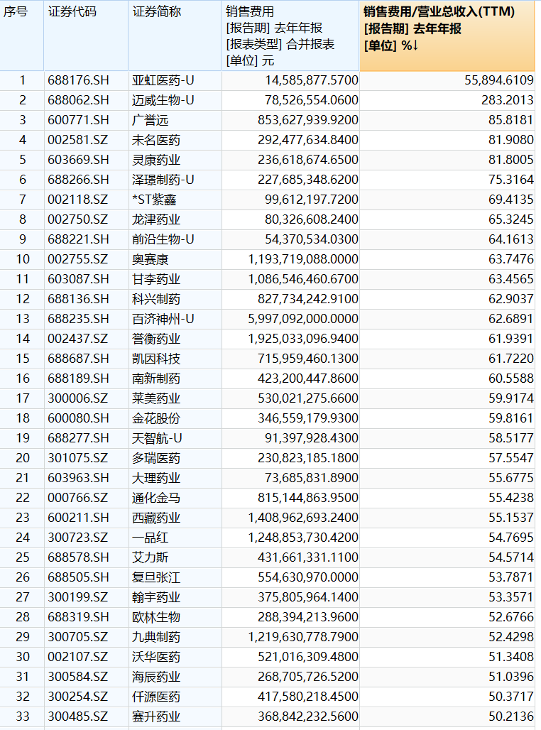 Wind数据显示,A股申银万国行业类医药生物板块中,除了部分尚未盈利的医药企业,2022年销售费用占营业总收入比重超50%的共有29家。8月7日,澎湃新闻记者以投资者身份随机联系了6家销售费用占总营收比重超50%的企业,广誉远(600771)、科兴制药(688136)、凯因科技(688687)、龙津药业(002750)、通化金马(000766)、誉衡药业(002437)等公司均表示,反腐行动对公司没有影响或影响较小。