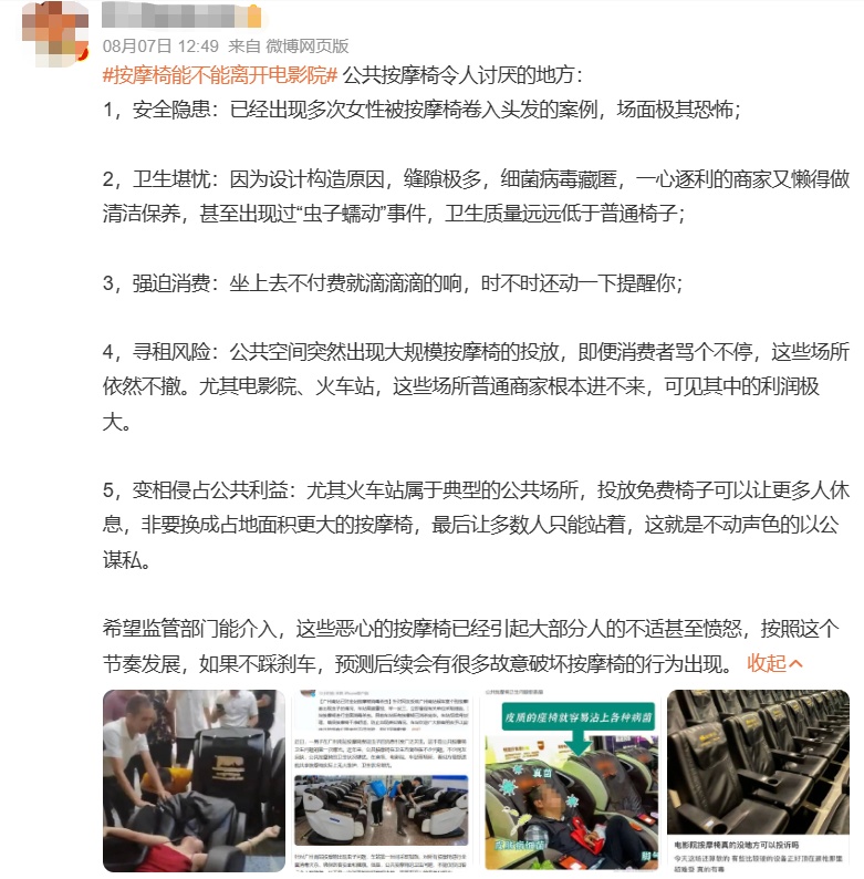 记者在微博中留意到,该话题的“热源”来自于一位千万粉丝的情感博主发的一张图片,标题为“电影院按摩椅真的没地方可以投诉吗”。