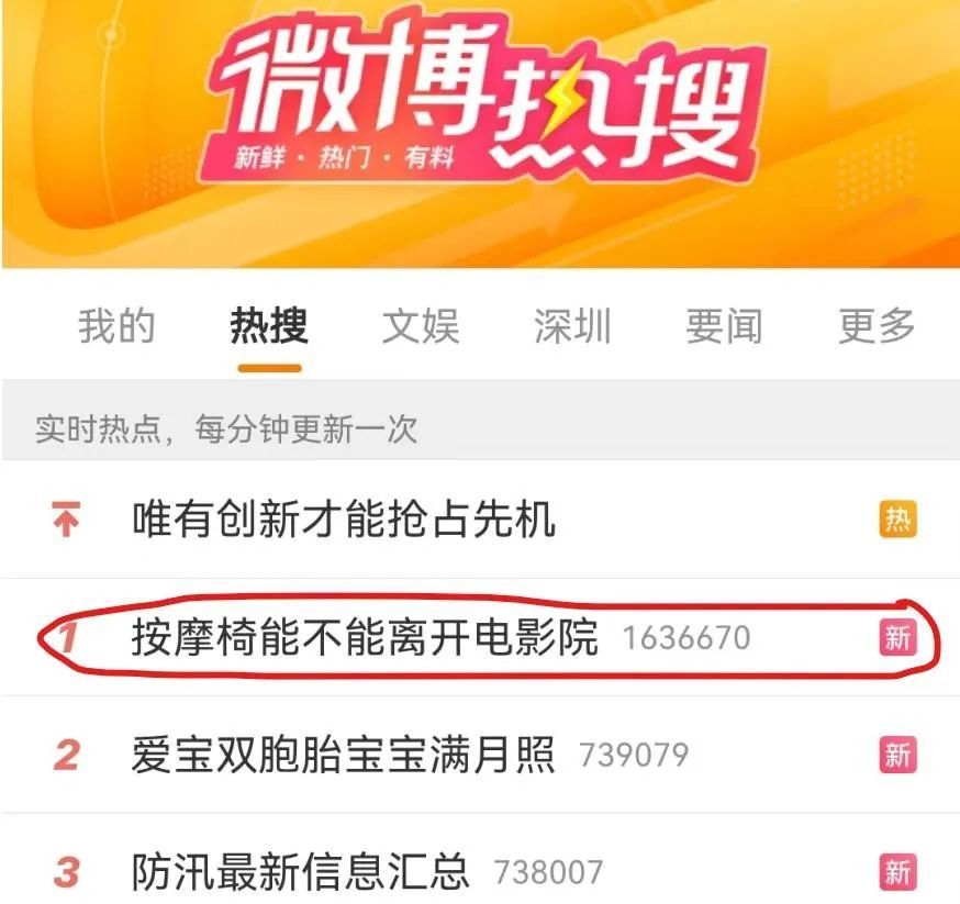 深圳已有多家影院安装了按摩座椅,如深圳万象影城、寰映影城、CGV影城等。有的按摩座椅需要扫座椅上的二维码付费启动,有的则“主动”让观众免费体验几分钟。