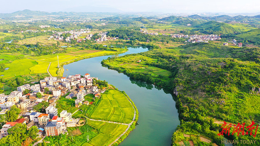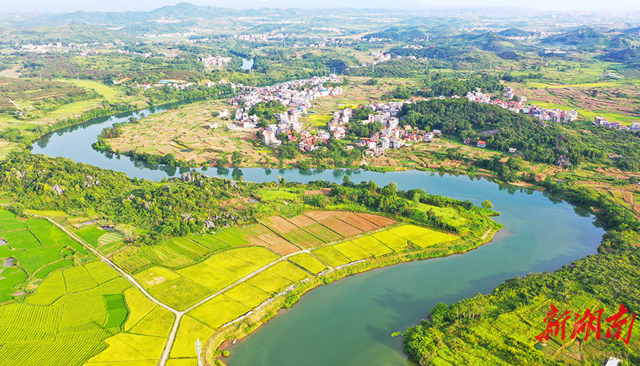 8月8日,新田县新隆镇贫佃湾村舂陵河段,青山翠绿,碧水如镜,河岸边金黄的稻田和错落有致的民居相互映衬,构成了一幅业兴景美的生态乡村画卷。近年,该县坚持生态优先、绿色发展理念,加大对水利建设和农田改造投入,积极打造河畅、水清、岸绿、产业兴的生态宜居宜业环境。刘贵雄 摄