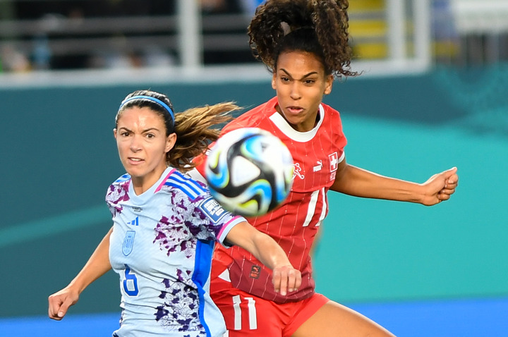 8月5日,女足世界杯八分之一决赛,西班牙队以5:1战胜瑞士队,图为西班牙队球员艾塔纳·邦马蒂(左)与瑞士队球员孔巴·索乌在比赛中拼抢。新华社记者郭磊摄